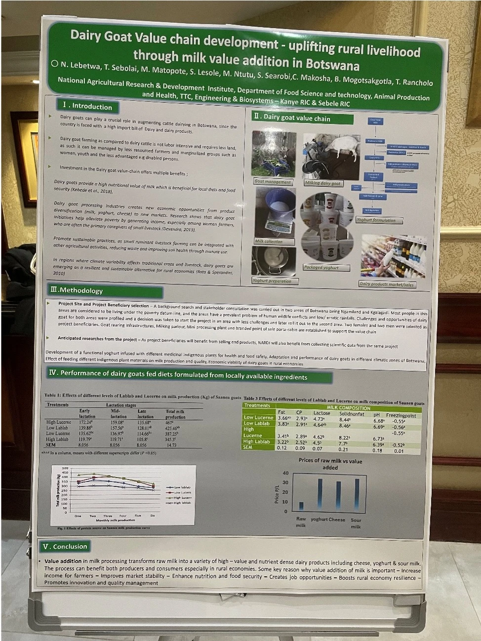 A typical goat produces 3ltrs of milk per day, which can produce seventeen (17) 175g yoghurt packets, a revenue of approximately BWP 255 (17 * 15).