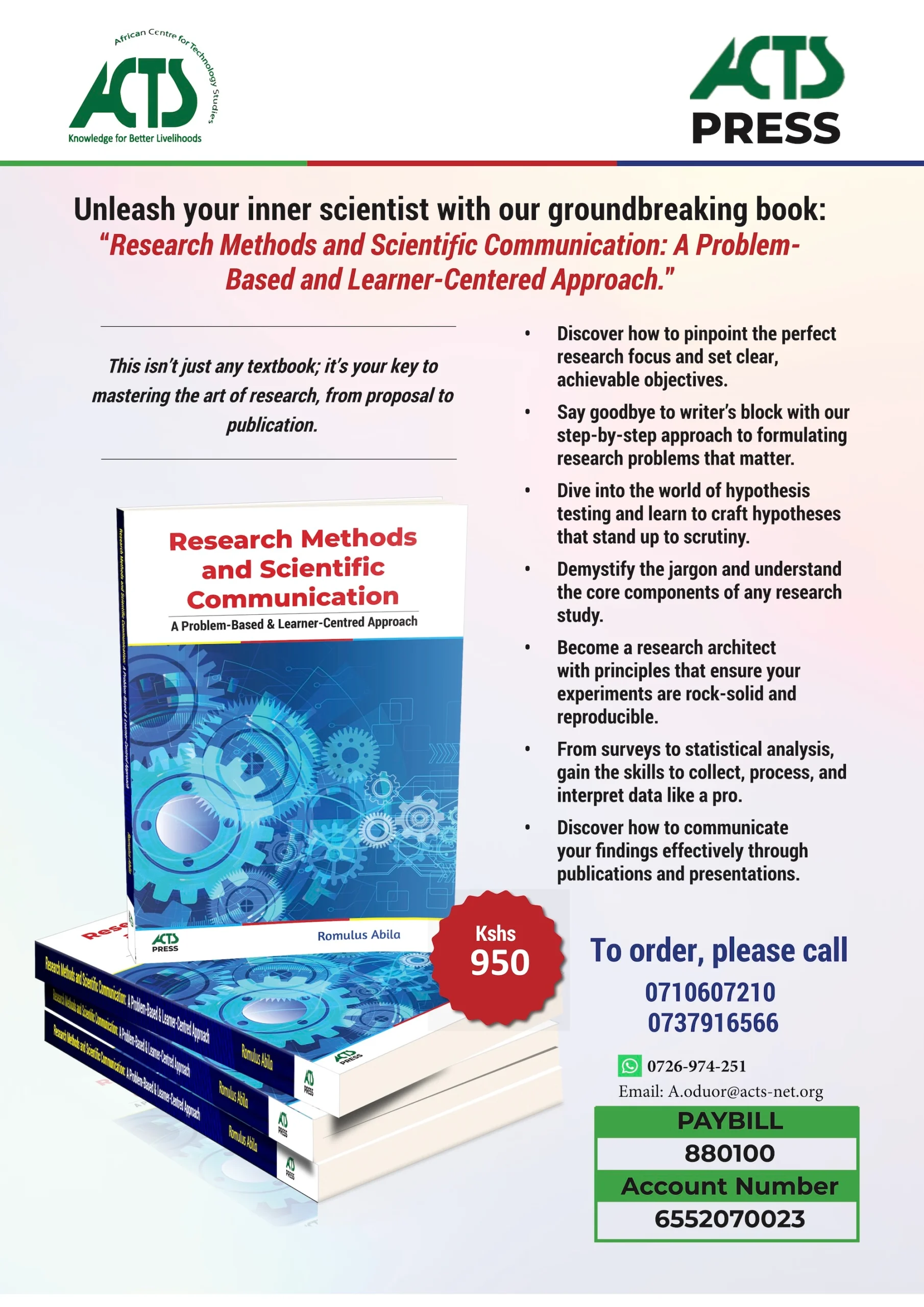 This approach is consistent with the paradigm shift in education that advocates for competency-based approach and knowledge discovery by the student, hence the learner-centred approach to learning. The Synthesis, Memory, Evaluation, Analysis, Application and Comprehension (SMEAAC) approach is well used in the book. This book is an interactive tool that uses case studies, student activities, scenarios, end of chapter questions and assignments. This makes it a primer in learning how to conceive a research idea, formulate research questions, develop a viable research proposal, collect and analyze data and present research findings through various dissemination outlets. In addition, it covers research approaches used in major disciplines such as natural sciences, humanities, education and economics. It is therefore appropriate to research students across all disciplines