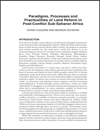 Over the last decade, many African countries have engaged in processes of land tenure policy and legislation reform. While the aims and assumptions of land tenure reform efforts differ widely, all purport to increase land tenure security for the rural poor. Land law reform is at an advanced stage in at least 17 countries in the continent (Angola, Burkina Faso, Cote d’Ivoire, Eritrea, Ethiopia, Mauritania, Mozambique, Namibia, Niger, Tanzania, Rwanda, Senegal, South Africa, Sudan, Tanzania, Uganda and Zanzibar), while new national land policies have been drafted or are under discussion in another eleven countries (Benin, Botswana, Gambia, Ghana, Kenya, Lesotho, Malawi, Swaziland, Togo, Zambia and Zimbabwe).