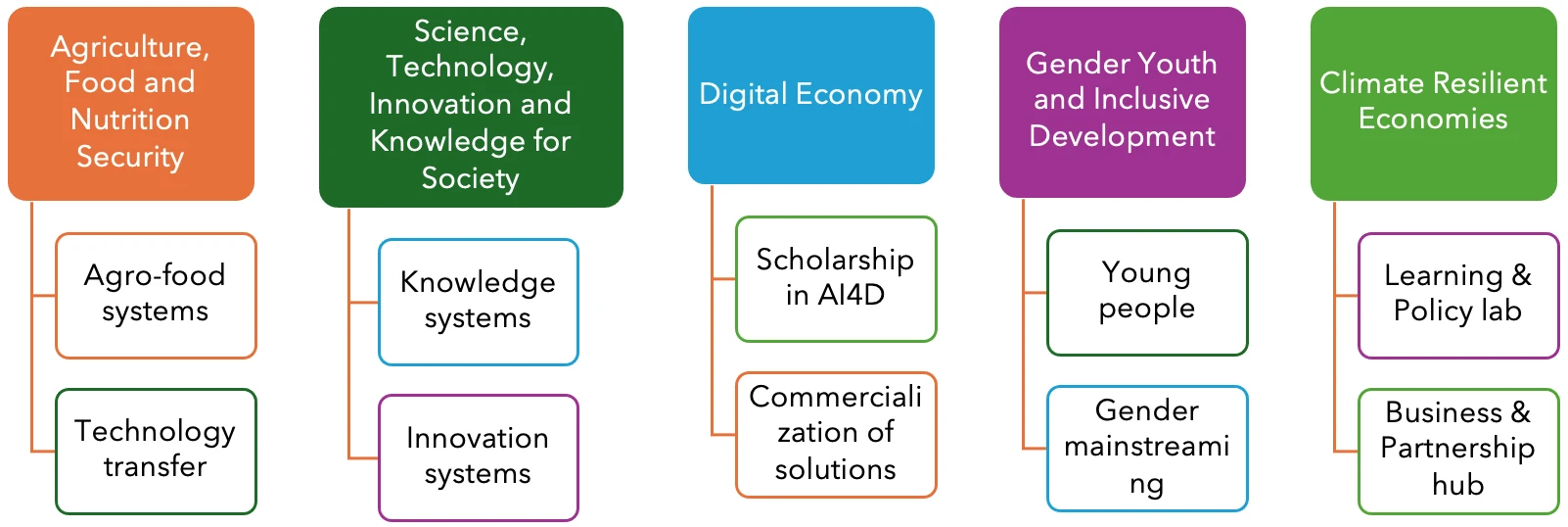 African Centre for Technology Studies (ACTS) has five programming areas including, Agriculture, Food and Nutrition Security, Science, Technology, Innovation and Knowledge for Society, Digital Economy, Gender Youth and Inclusive Development, and Climate Resilient Economies.